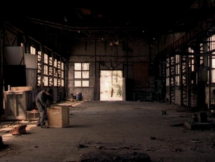 意外的发现是,影迷在吉罗迪电影里观察到一种“水平的视线”(比如《宽恕》和《保持站立》中从行驶的车上拍摄转弯时的外景,是视线的水平平移),但在《老梦前行》中,吉罗迪似乎首先是用纵深来构筑空间,光从纵深处照来,人向纵深处走去,消失在空间的秩序里,不是夕阳在窗外和工厂室内的黑暗形成对照,就是阳光把铁锈照得跟黄铜一样,了无声息的情欲幽灵像在这个工厂游荡了几个世纪。